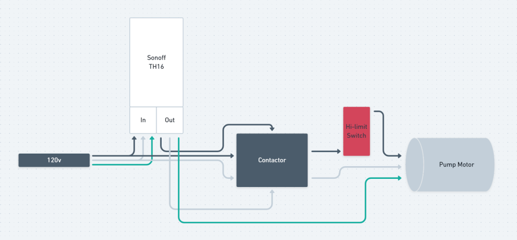 New: 120v → GCFI Plug → Sonoff TH16 → Contactor → Hi-limit Switch → Pump Motor